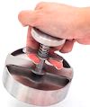 Hamburgerpresse/hamburgerstanse produsert i rustfritt stål med utpressemekanisme. Diameter på 130mm. Alle deler demonteres enkelt for vask i oppvaskmaskin. Se video av bruken her.