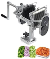 Vår terningkutter, TK107, er et tids-og arbeidsbesparende redskap til å kutte poteter, løk og annet i terninger. Det følger med gitter/knivsett på ca 13x13x5mm og 7x7x5mm. Monteres ved hjelp av brakett på arbeidsbenken, eller på plate som leveres som ekstrautstyr. Mål: H 335 x B 331 x D 200 mm.