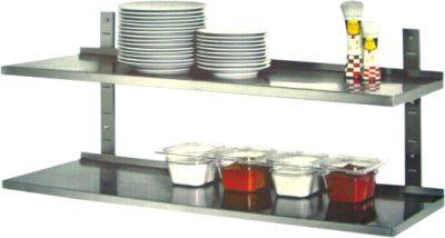 Dobbel vegghylle i rustfritt stål, 600x350 mm. Leveres komplett med 2 veggskinner, 2 hylleknekter og 2 hyller.